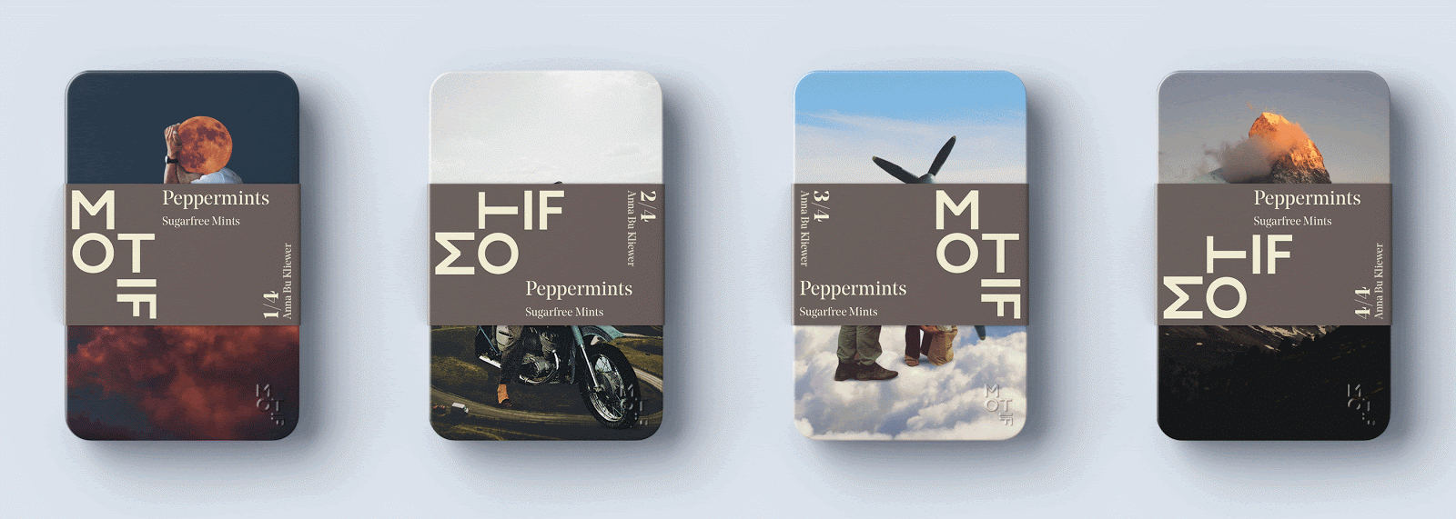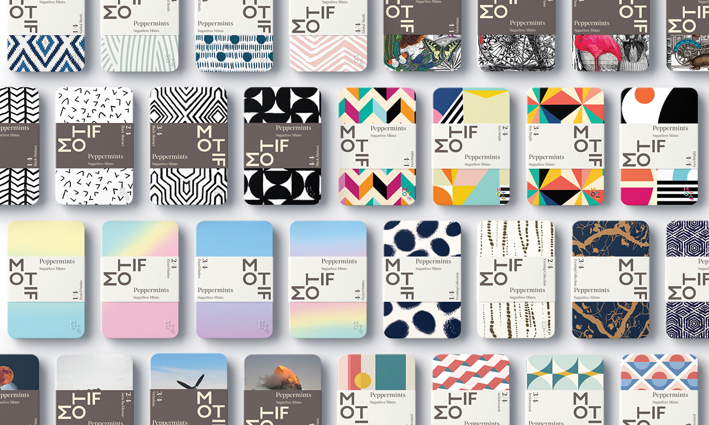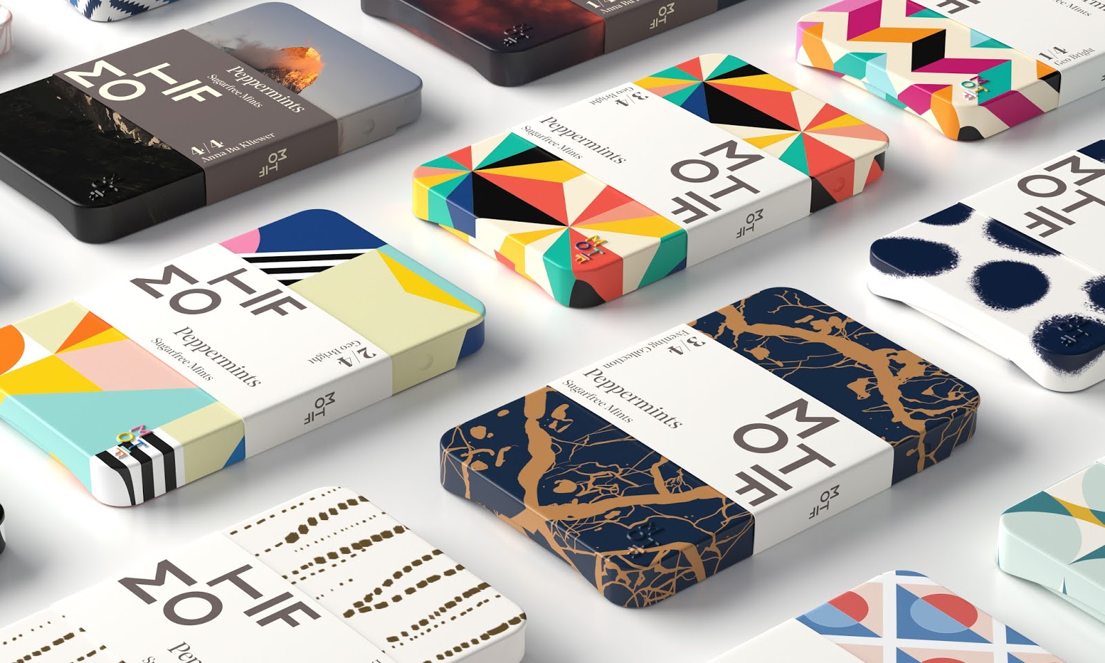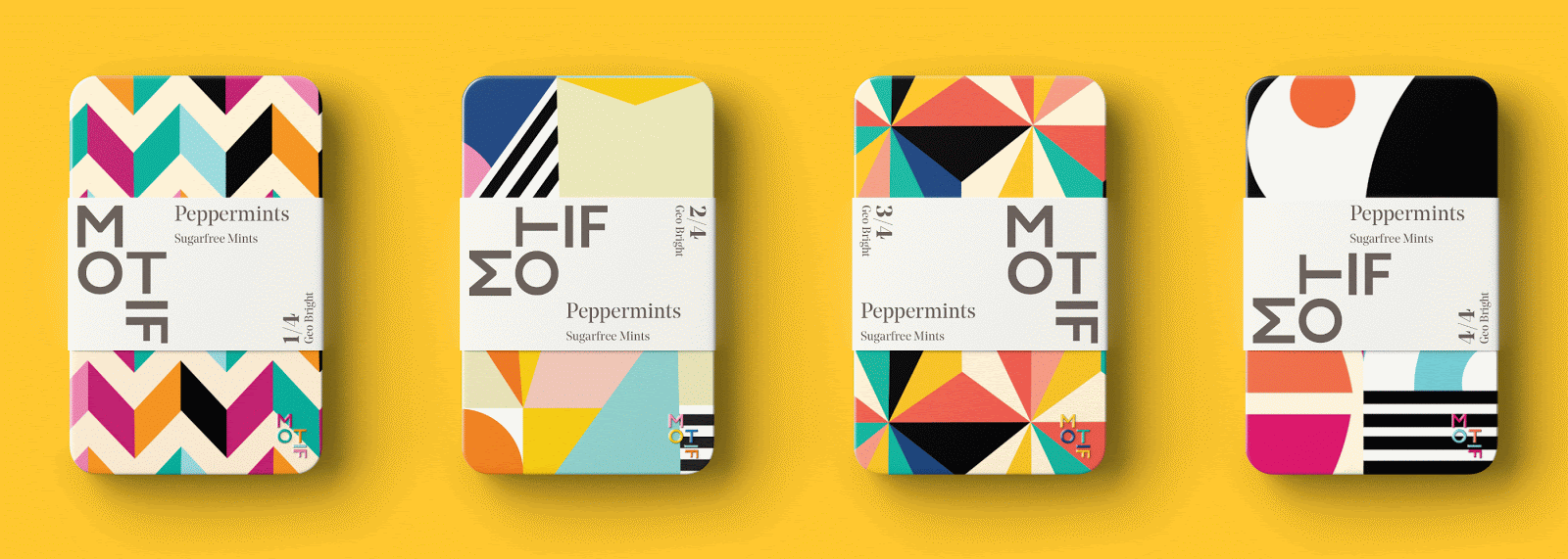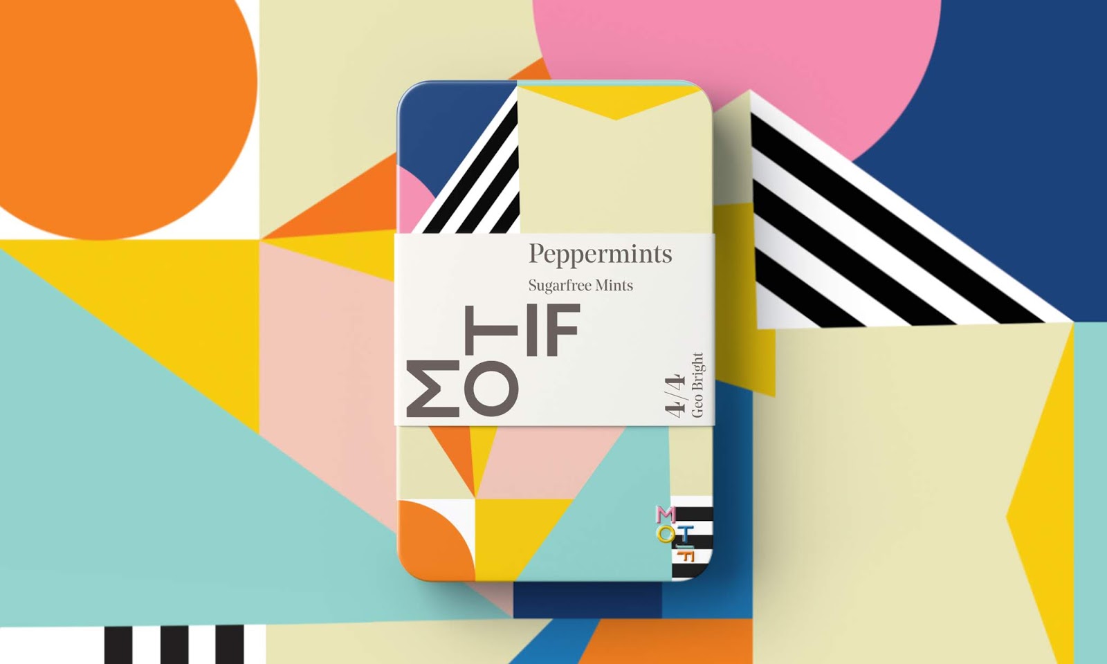 Motif薄荷糖包裝設(shè)計,使用抽象的幾何元素與風(fēng)景人物進行換位的方式,突出了薄荷糖,口味刺激多變的特點。