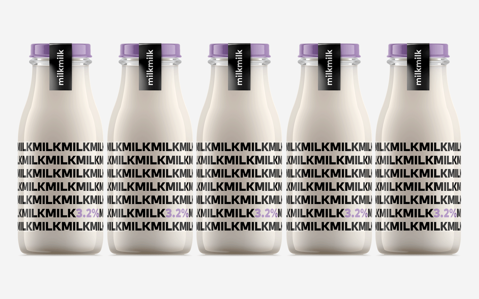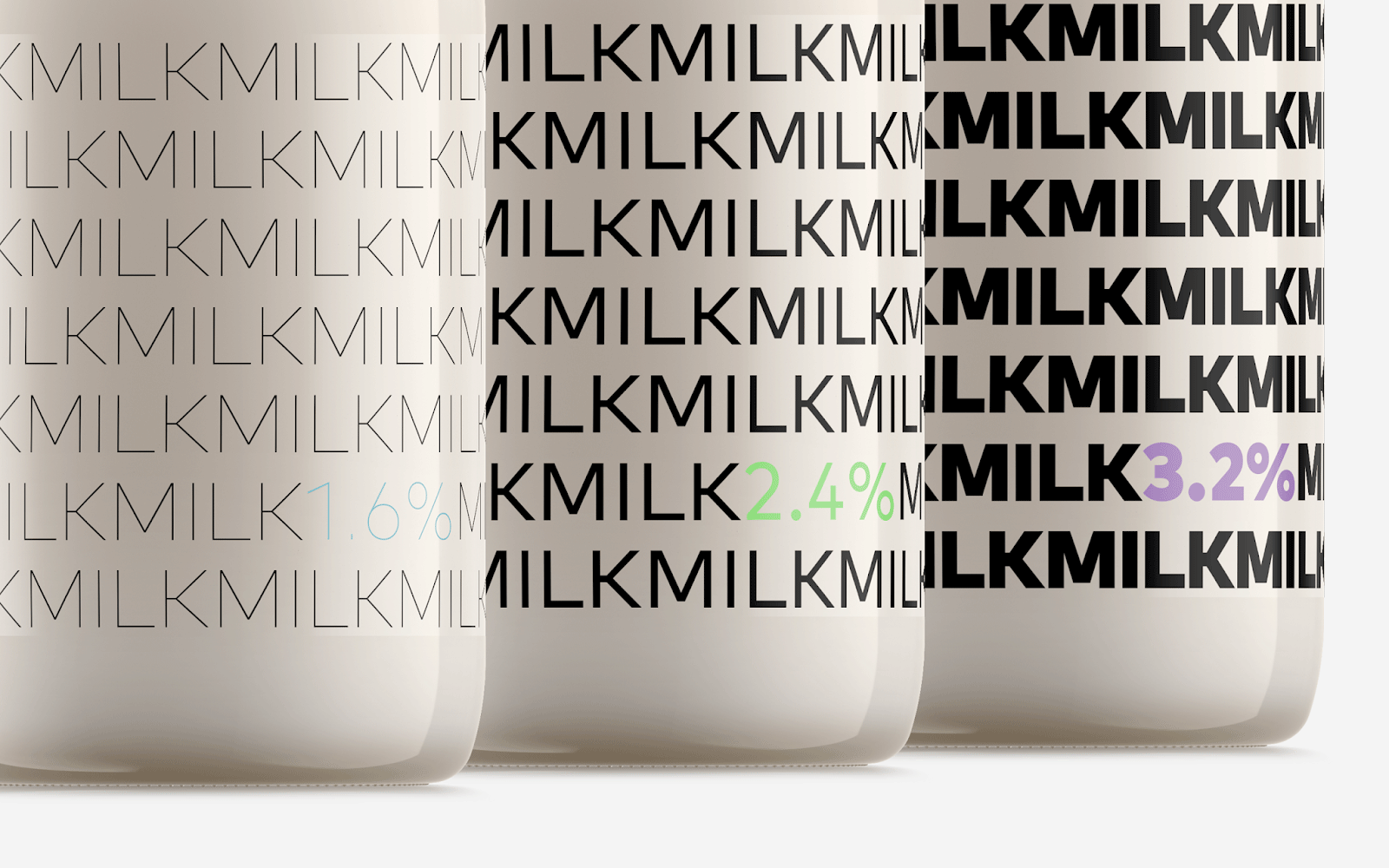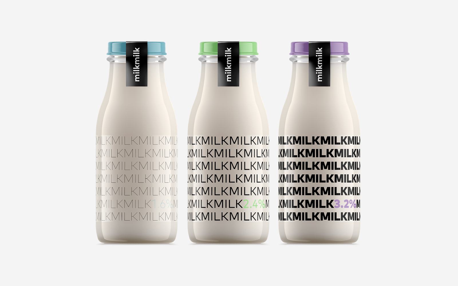 阿塞拜疆設(shè)計(jì)師Rahim Ismayil設(shè)計(jì)的牛奶包裝,設(shè)計(jì)師通過字體粗細(xì)來表現(xiàn)牛奶的脂肪含量。粗體字表示脂肪含量高,而細(xì)體字則表示脂肪含量低。通過瓶蓋顏色和極簡外觀讓人有一種新鮮直觀的感覺。讓人在遠(yuǎn)處看到,想走近拿起來,進(jìn)一步了解情況的沖動(dòng)。